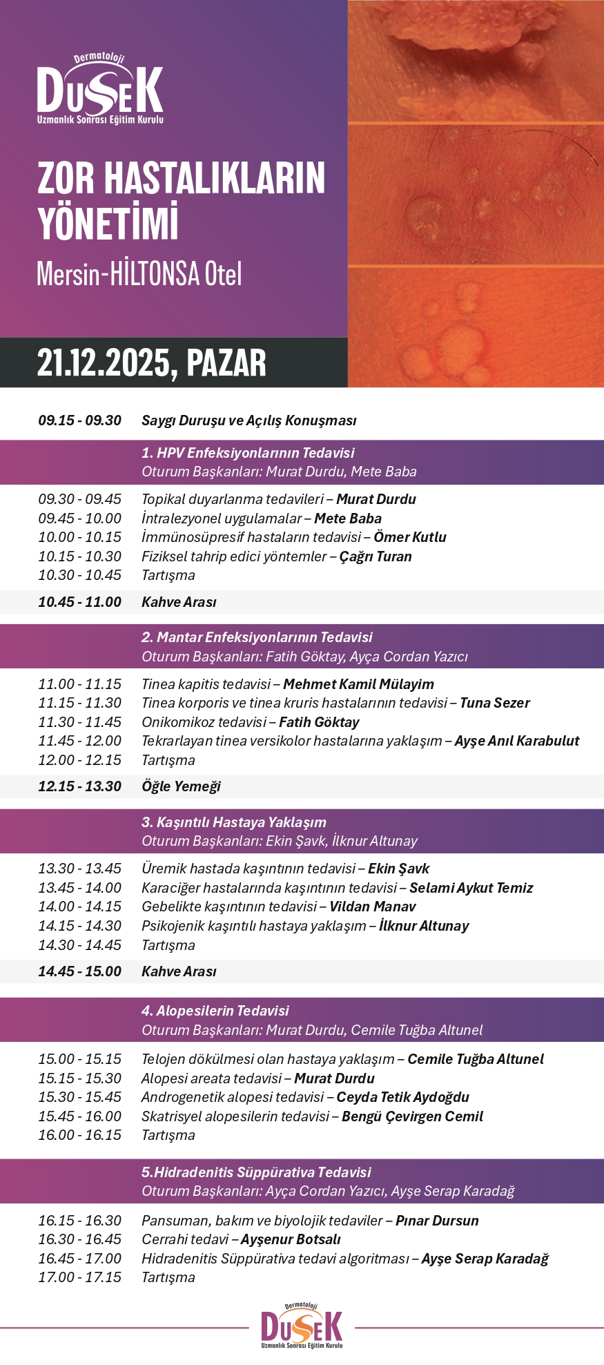 Dermatoloji Uzmanlık Sonrası Eğitim Kurulu (DUSEK) - Zor Hastalıkların Yönetimi Kursu, 21 Aralık 2025 Pazar günü, Mersin HİLTONSA Otel ‘de yüz yüze düzenlenecek ve online eğitim olmayacaktır.